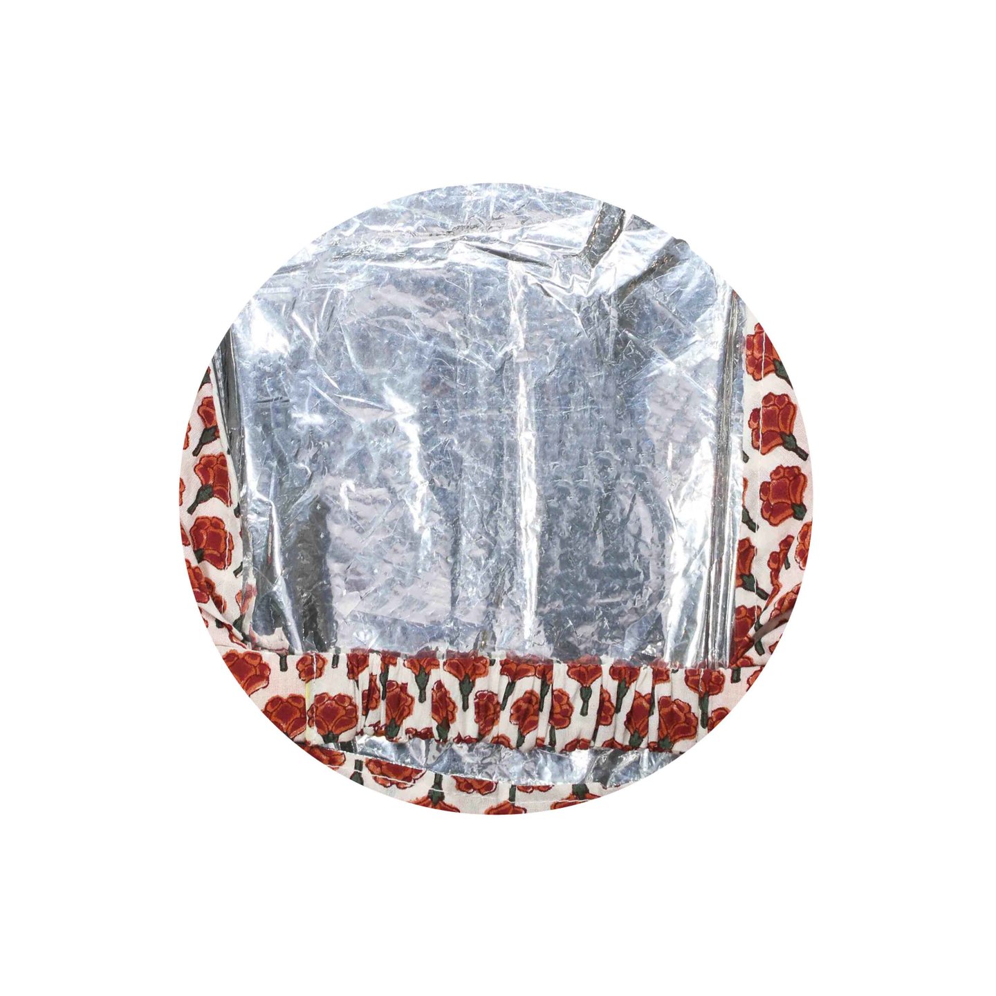 カラー塗布後にサランラップの上から装着。裏地に保温アルミシートを縫い合わせているので、保温促進しカラーリングの浸透効果アップ。おしゃれな生地仕様で、急な訪問があっても心配ありません。